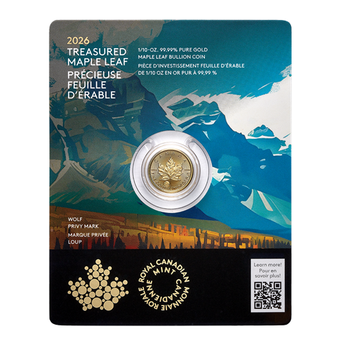 Ornées d’une marque privée spéciale représentant un loup, les pièces Précieuse Feuille d’érable en or, idéales pour souligner une occasion spéciale, incarnent la qualité, la pureté et le savoir-faire qui font la renommée des pièces fabriquées par la Monnaie royale canadienne.