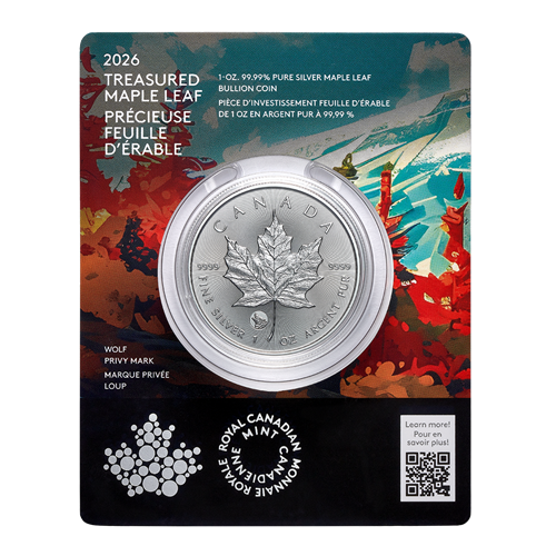 Ornées d’une marque privée spéciale représentant un loup, les pièces Précieuse Feuille d’érable en argent, idéales pour souligner une occasion spéciale, incarnent la qualité, la pureté et le savoir-faire qui font la renommée des pièces fabriquées par la Monnaie royale canadienne.